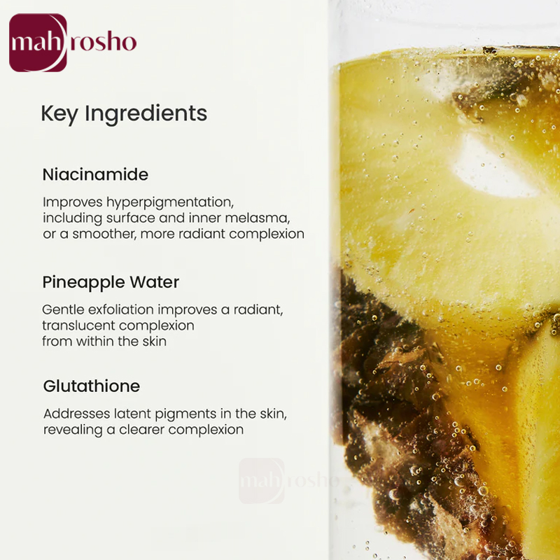 - آب آناناس حاوی یک آنزیم طبیعی به نام "بروملین" است. این آنزیم در اینجا نقش یک لایه بردار آنزیمی را ایفا میکند. به جای اینکه پوست را با ذرات فیزیکی یا مواد شیمیایی تحریک کند، این آنزیم پروتئینهای (سلولهای مرده) روی سطح پوست را به آرامی هضم میکند و پوست شما را شفافتر، نرمتر و درخشانتر نشان میدهد. این یک گام مهم برای آماده سازی پوست برای جذب بهتر نیاسینامید و گلوتاتیون است.