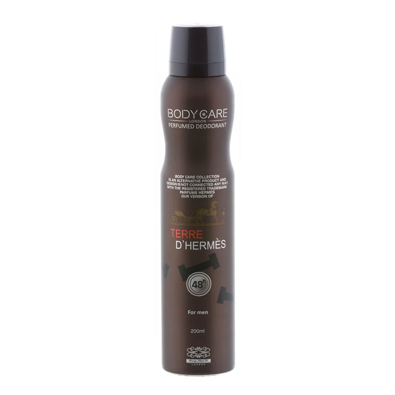 اسپری بدن BODYCARE اسپری تق هرمس مردانه بادی کر که الهام گرفته از ادکلن Hermes Terre d’Hermes می باشد دارای رایحه تند و تلخ و جزو گروه بویایی چوبی تند قرار می گیرد که رایحه این اسپری مردانه رابسیار جذاب تر می کند. باید گفت برند بادی که در تولید اسپری بدن بهترین رایحه ها را استفاده کرده است و استفاده از عنوان پرفروش ترین برای یک رایحه از آن شاید عبارت صحیحی نباشد. اسپری بدن BODYCARE با ماندگاری 24 ساعته و حجم ۲۰۰ میلی لیتر با قیمتی مناسب در اختیار کاربران قرار گرفته است اسپری بدن BODYCARE دارای قدرت ماندگاری بالا بر روی بدن می باشد از آنجا که ساختار اسپری بدن BODYCARE برای اسپری بر روی بدن می باشد باید توجه داشت که زمانی که بر روی پارچه و یا لباس اسپری میشود مقداری لک از خود به جا می گذارد که البته این امر کاملاً طبیعی می باشد زیرا این اسپری برای افشاندن بر روی بدن ساخته شده است اسپریهای بدن دارای ساختاری ضد حساسیت میباشند لذا از مواد مرغوب تری نسبت به اسپری های لباس ساخته شده اند.